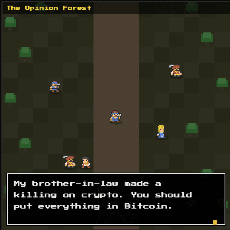 A fun retro 2D style video game where “the hero” aka the prospect/client navigates behavioral finance uncertainties like “The Opinion Forest” until ultimately they meet a sage wizard, “The Iconoclastic Guide”.